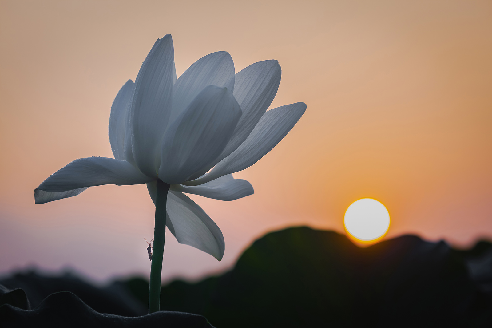 - 촬영 시간: 오후 06시 18분 (일몰). 한낮의 뜨거운 열기가 가라앉고, 부드러운 노을빛이 하얀 연꽃잎을 투명하게 물들이며 하루를 차분하게 마감하는 시간입니다.